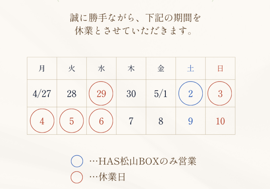 2026年5月2日(土)※HAS松山ボックスは営業