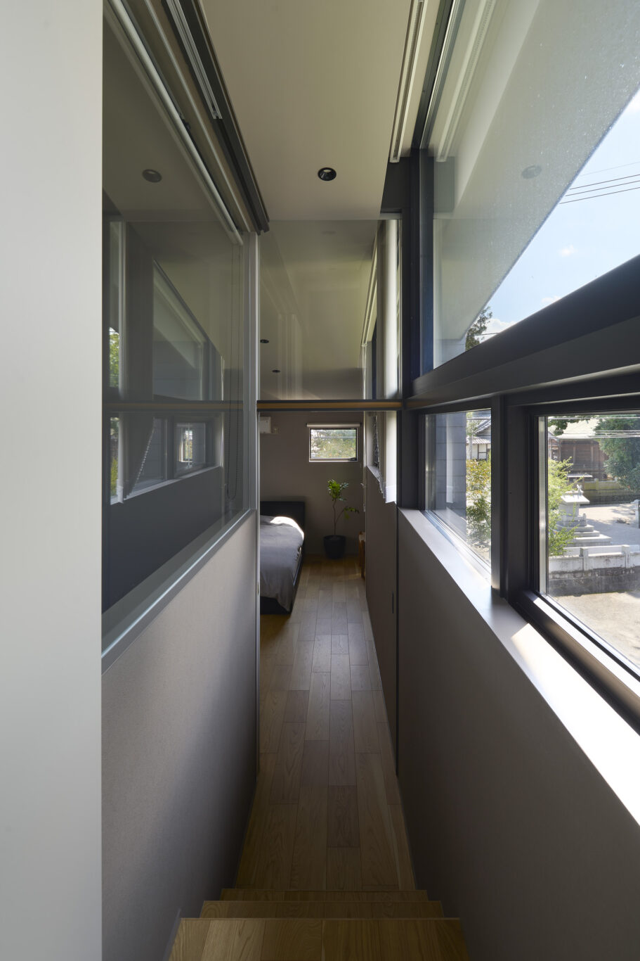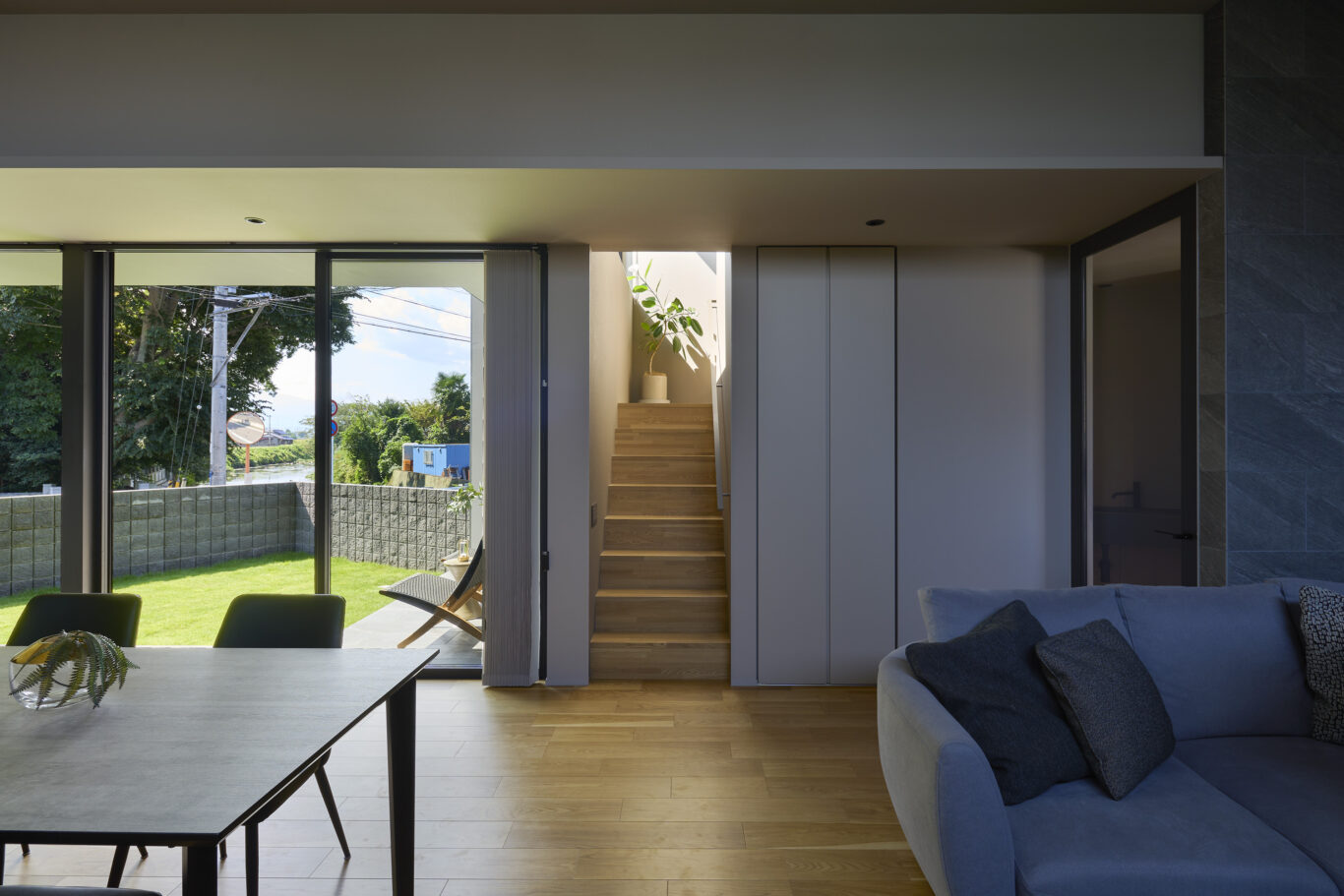 風情のある川の景色が家の中での生活のシーンに取り込めるように各窓の設置位置や角度は、景色が切り取られるよう考えられています。