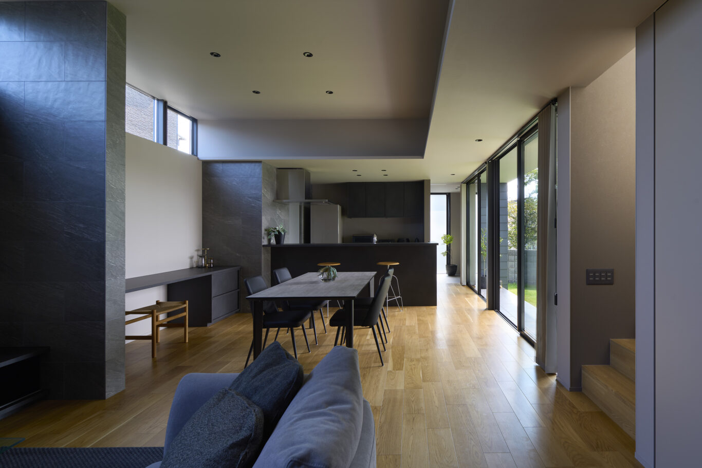 家族が集うリビングは、ハイサイド窓や間接照明によってより高さを感じ、広がりのある空間になっています。